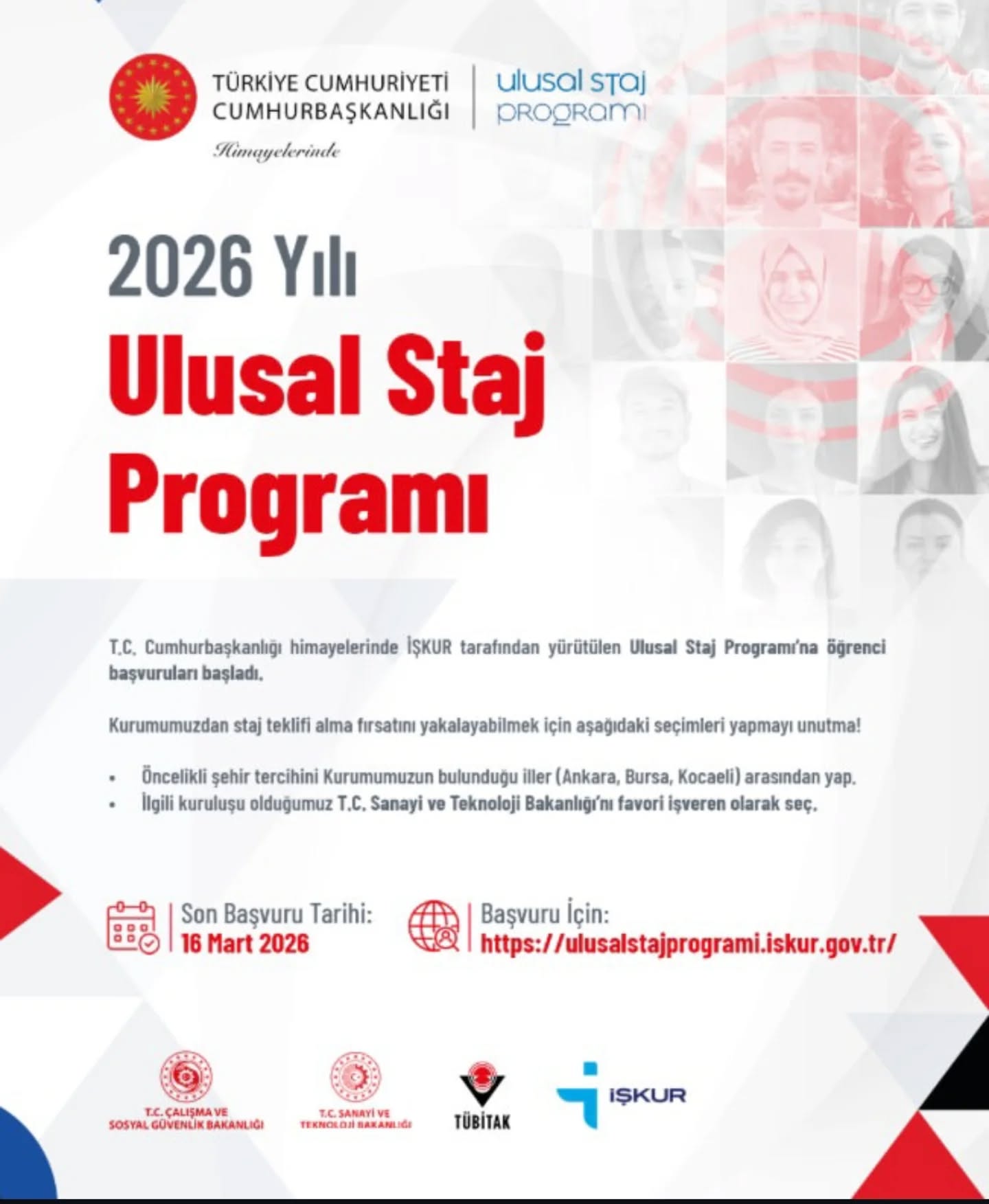 Başvurularınızı İŞKUR üzerinden yapabilirsiniz. Son başvuru tarihi: 16 Mart 2026 Başvuru Linki: https://ulusalstajprogrami.iskur.gov.tr |