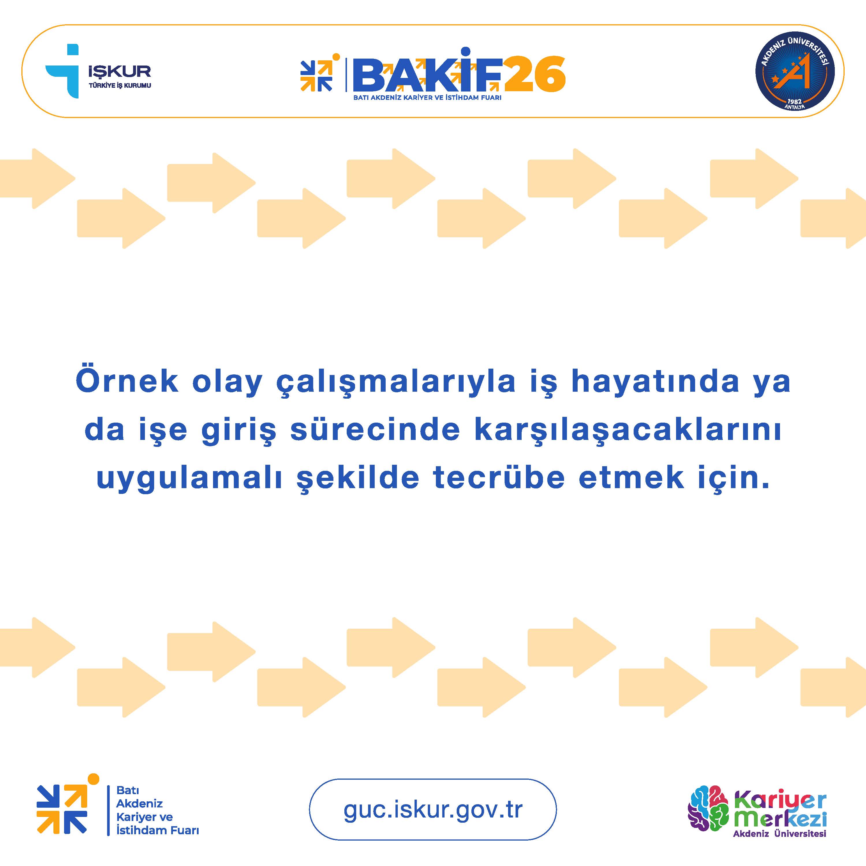 | 13–14 Nisan tarihlerinde Antalya’da düzenlenecek BAKİF 2026 Batı Akdeniz Kariyer ve İstihdam Fuarı; sektör temsilcileriyle birebir iletişim kurma, kariyer fırsatlarını değerlendirme ve staj/iş imkânlarını inceleme açısından önemli bir fırsat sunmaktadır. | |